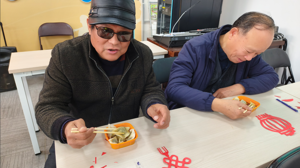 剪纸活动结束后,工作人员还精心组织了包饺子环节。大家围坐一堂,和面、调馅、擀皮、包制,分工协作,其乐融融。当热气腾腾的饺子端上桌时,浓浓的饺子香与欢声笑语交织在一起,温暖了每个人的心田。