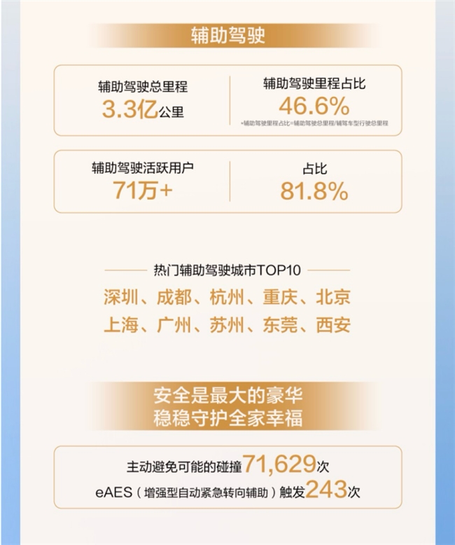 秉承“安全是最大的豪华”理念,问界持续为用户带来更智慧、更安全的出行体验。春节期间,问界辅助驾驶系统累计避免可能的碰撞71629次,eAES(增强型自动紧急转向辅助)功能触发243次。在春运车流密集、驾驶员易疲劳的场景下,这种主动安全防护的价值,远超出传统豪华配置的范畴。