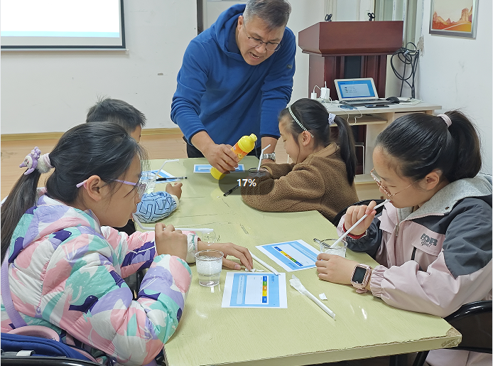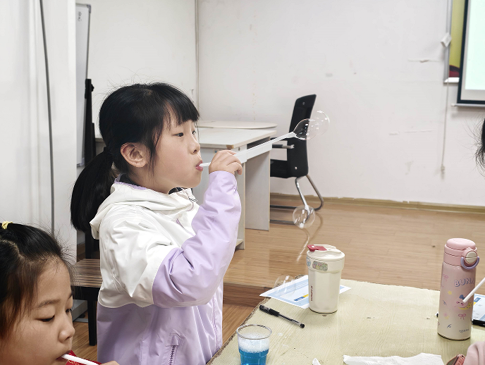 故事分享结束后,趣味科学实验环节正式拉开帷幕。本次活动精心设计了8个简单易操作、现象直观且贴合生活的实验项目,所有物料均来自日常居家常见物品,环保易得,充分体现春假居家实践的适配性。在工作人员和志愿者的分组指导下,孩子们有序开展实验:彩色泡泡水中,洗洁精、清水与白糖的巧妙搭配,借助表面张力原理吹出一个个绚丽的泡泡,孩子们追逐嬉戏,笑声不断;纸巾彩虹桥实验里,白色纸巾在水彩和清水的作用下,通过毛细现象慢慢晕染出斑斓色彩,让孩子们直观感受液体流动的奥秘;鸡蛋沉浮实验中,随着食盐的不断加入,原本沉在杯底的鸡蛋逐渐上浮,密度原理在动手操作中变得通俗易懂。